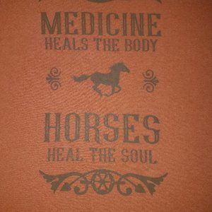 Port & Company brand orange short sleeved tee shirt that reads - "Medicine heals the body, horses heal the soul". Size medium. 100% cotton. Never worn. Please see photos. The photos are part of the description.