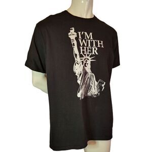 Black color, "I'm With Her" print on the front, crew neckline, short sleeves, pullover, regular fit, lightweight, breathable and very comfortable. Great condition!