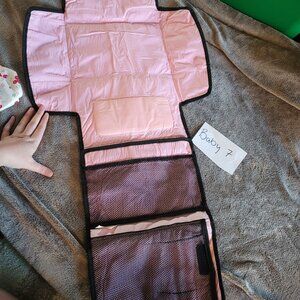 This comes with a reusable, washable dirty clothes/Diaper bag (2nd Picture). This changing table holds all that you need for diaper changes. Feel at easy changing baby anywhere, no need to worry if there's a changing table when you're out in public.