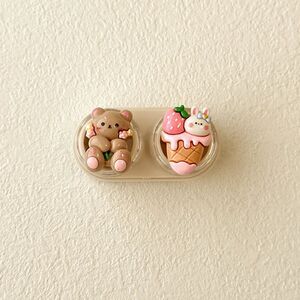contact lens case, lens container, kawaii storage, white, cream, pastel blue, brown, pink, multicolor, cartoon, animal print, bear motif, plastic, glossy finish, smooth surface, cute, whimsical, novelty, decorative, travel, everyday use, gift, stocking stuffer, spring summer, playful, trendy, adorable, stylish, charming, collectible, unique, fun