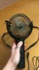 Black battery-powered and/or rechargeable fan with lanyard for wearing around your neck. Handle also bends so that you can set it down and use on a flat surface.