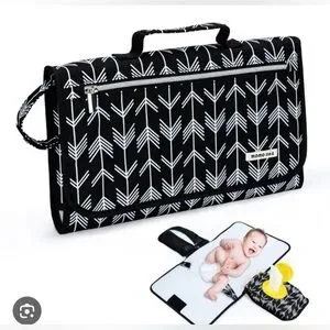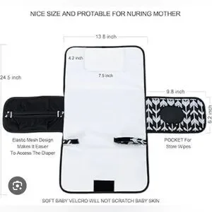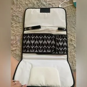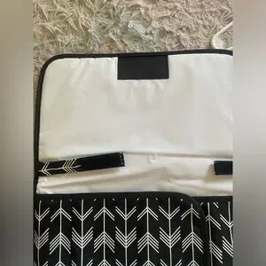 Brand new. Never used after I had my daughter. Cute design. Color is black and white. Place for wipes and Velcro to make it more portable.