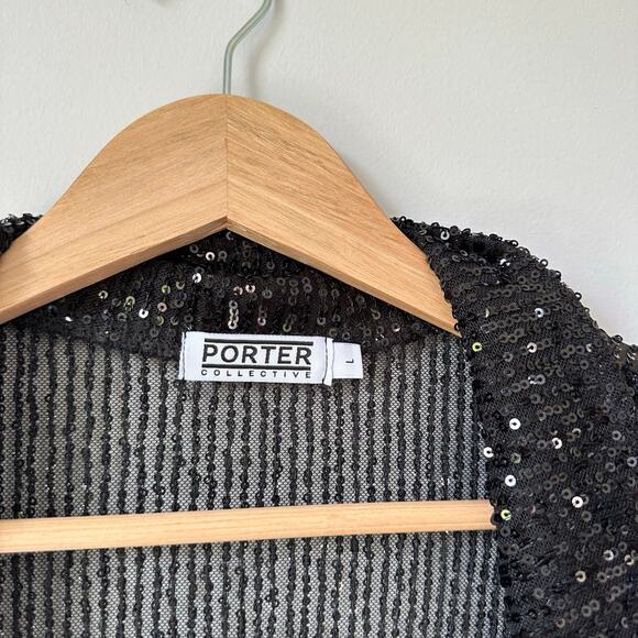 Porter Collective Sequins Townes Sheer Button Front Long Sleeve Blouse Black L