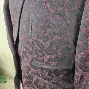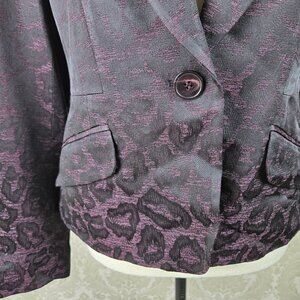 Traditional styled blazer in a purple and black animal print. 1 button front closure. Flap pockets on front are still sewn shut. Fully lined. Light shoulder padding for shape.