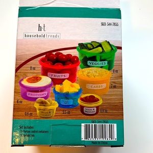 Household Trends portion control container set. Leak proof and stackable. Nests for easy storage. Color coded, labeled containers. Microwave and dishwasher safe. BPA free. New.