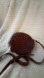 Round leather crossbody bag. Rich brown color. Adjustable strap. Embossed brand logo.