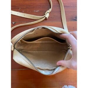 Beautiful Portland Leather Goods small crossbody bag in a soft cream leather. Features full-grain leather, a zip-top main compartment, exterior slip pocket, and an adjustable shoulder strap for everyday wear. Unlined suede interior typical of PLG bags.