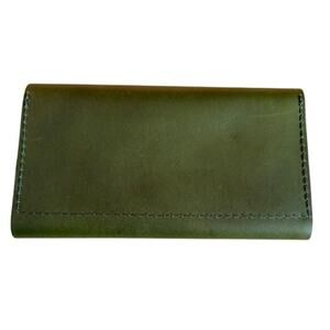 Beautiful full-grain leather tri-fold wallet by Portland Leather Goods in a deep forest green. Handcrafted, minimalist design with signature PLG hardware snap and clean stitching. Inside features multiple card slots, a bill pocket, and an open compartment for receipts or cash. Folds smoothly and feels luxe in hand. Excellent condition with minimal signs of handling—rich patina will continue to develop with use. Perfect for everyday carry or gifting.