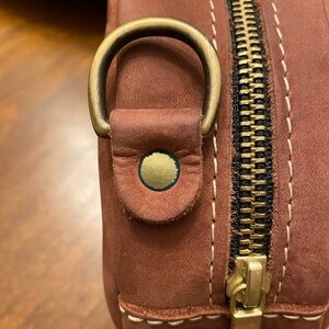 Fair used condition. This is a brushed leather and scratches can be brushed out with a baby brush. There is oxidation on the hardware. Please note picture. No strap included with this bag. One interior and one exterior pocket.