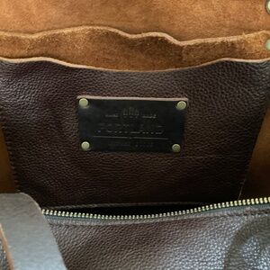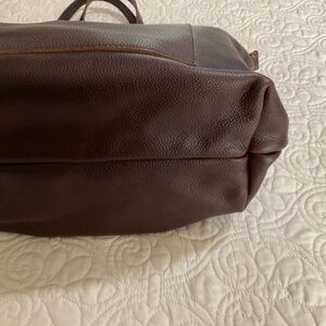 Portland Leather oversized zipper top tote. Sturdy handles that soften over time, inside and outside pockets, brass rivets and key loop. 13” tall, zipper top 21”, handles drop length 10.5” Full grain leather unlined natural suede on the inside.. All measurements are approximates due to variations in leather items.