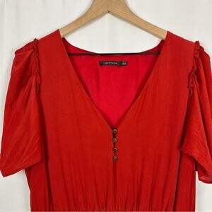 Elevate your wardrobe with this stunning Portmans dress, crafted from 100% silk and featuring a beautiful ruby red color that’s perfect for the holidays or the office. The faux button V-neck design, ruffle trim at shoulders and short sleeves add a feminine touch, while the wide elastic waist creates a defined silhouette, making it flattering for all body types. The midi length and straight skirt provide a timeless look that can easily transition from day to night.