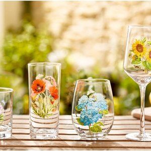 FLOWER DESIGN: Each wine glass features a different hand-painted motif - sunflower, poppy, sweet pea, and hydrangea. This set is a great hostess or bridal shower gift.