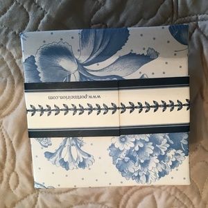 Adorable Botanic Blue China trinket box by Portmerion. Three and 3/8 inches round China box. Holds your precious rings and other small things or just graces a shelf or table. I have two of these but sold separately. These are great gifts for holidays or any occasion. The blue and white patterns are always favorites.