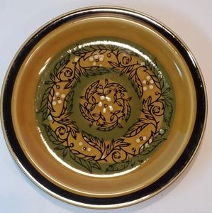 Green, dark brown, and golden honey colored "Porto Fino" pattern stoneware replacement salad plate. Featuring an expertly hand painted berry, leaf, and floral design. 7 & 1/4 inch diameter, 3/4 inch high. Oven and dishwasher safe. 8 available. There are some minor scratches but overall they are all in great condition. There is no glaze crackling on these pieces.