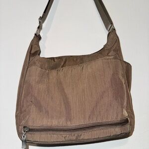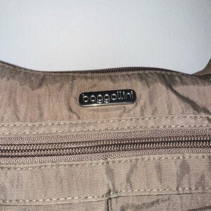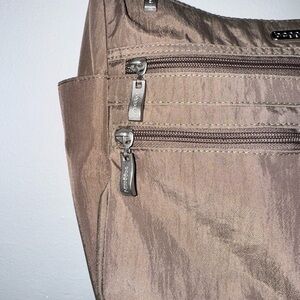 Stylish Baggallini shoulder bag in Portobello. Features multiple zippered pockets. Perfect for everyday use.
