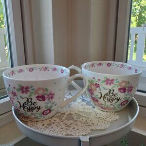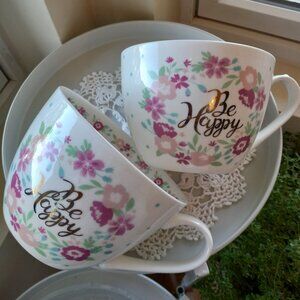 Delicate pink flowers on the cup and sign 'Be happy" will help make your day brighter!