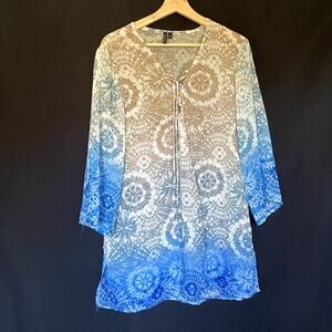 Portocruz geometric blue tan beige swimsuit coverup long sleeves flowy boho L