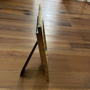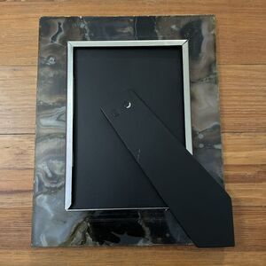 Neutral, brown colored, agate gemstone, photo frame by Portofino Home. The freestanding, 8x10 in picture frame has a portrait orientation and holds one 5x7 photo. The frame has beautiful translucent bands of color that pop when backlit as shown in photos. Gold edges. Classic yet modern frame which will fit in with a variety home or office décor. In great pre-owned condition.