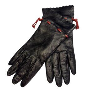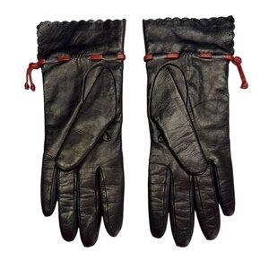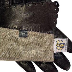 Elegant and timeless, these Portolano dark brown Napa leather gloves are crafted from soft, full‑grain leather and fully lined with 100% cashmere for luxurious warmth. These women’s gloves are a size 7½ (medium) and feature scalloped wrist trim with distinctive cognac leather piping and tie detail, setting them apart from classic glove styles.
