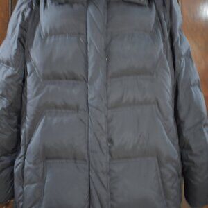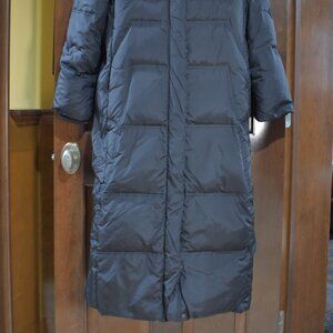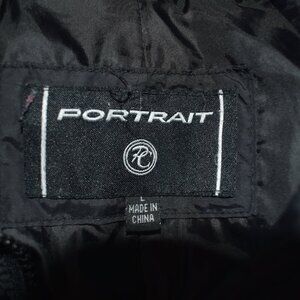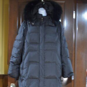Portrait Long Black Puffer Coat Women’s Size Large Hooded with Fox Fur Trim