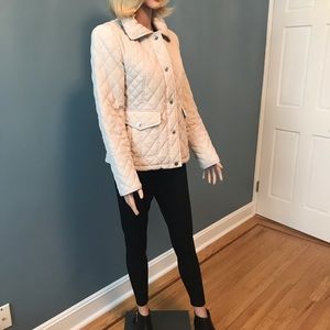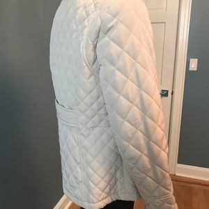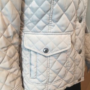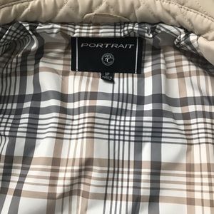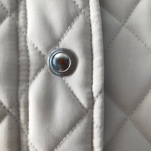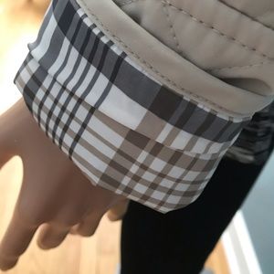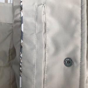 Great spring lined jacket with silver snap-on buttons and functional side pockets. Tartan style interior mirroring the design from Burberry. Sleeves can be cuffed to show the tartan design. Jacket in very good condition - buttons slightly tarnished but not noticeable while worn since it looks so shiny like a mirror image. No stains, rips or funky order. Great waffle exterior design. Very stylish and has many more years of wear.