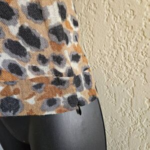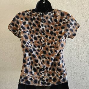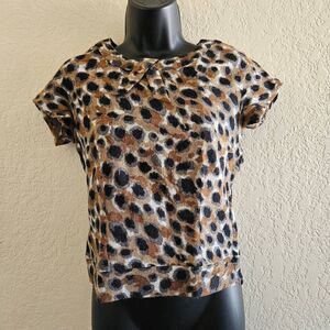 Chic and cozy, this wool blouse from Portrait of a Girl (an Anthropologie brand), features a bold leopard print in shades of brown, tan, and black. The soft, textured fabric offers a warm yet lightweight feel, perfect for transitioning seasons. Designed with a subtle Peter Pan-style collar, short sleeves, a side zipper, and a relaxed, boxy fit, it adds effortless sophistication to any look.