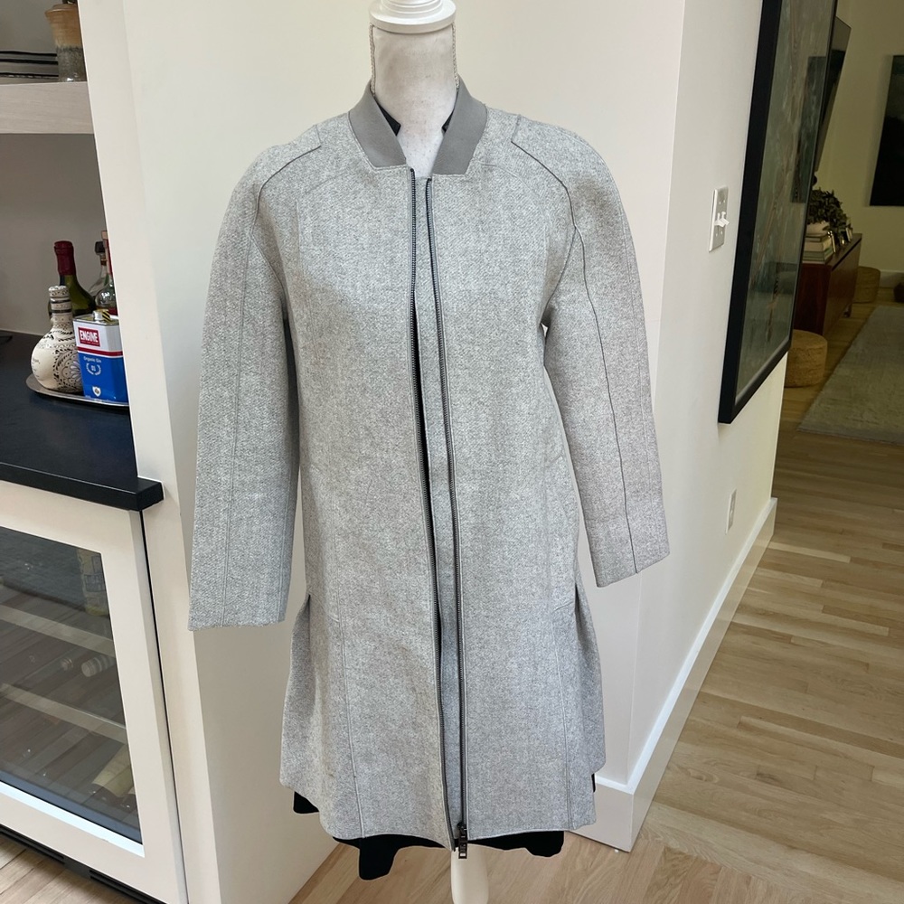 Light gray car coat. Full zip and in excellent condition. A sweet pleat on the bottom back sides.