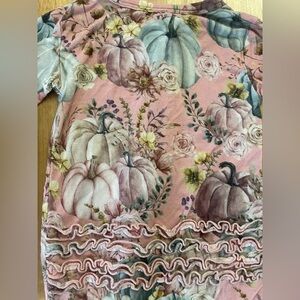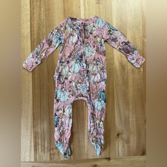 Soft pink footie with floral pumpkins design. Features ruffle details and zipper closure. Bamboo fabric.