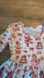 Charming dress with gingerbread and bow design. Features long sleeves and ruffled hem.