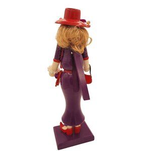 This sassy nutcracker lady is ready to crack more than just nuts! Decked out in her purple dress, red hat, and matching accessories, she's the life of any shelf.