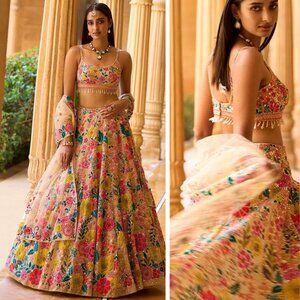 Posh Yellow Multi Floral Embroidered Umbrella Lehenga Choli Dupatta Set