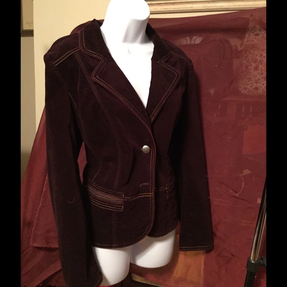 Posh velvety like form fitting jacket. Tapers in below bust accentuating your waist. Cut perfectly !!! Beautiful burgundy color ! Looks great in jeans, skirt , slacks and dresses.