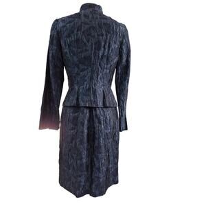 Stunning Carmen Marc Valvo, size 8, Deep Navy metallic damask cocktail or formal dress with size 4 jacket, both satin lined. The dress has sequin trim at the straps, the deep square neckline, and waistband, and there is a zipper down the back.
