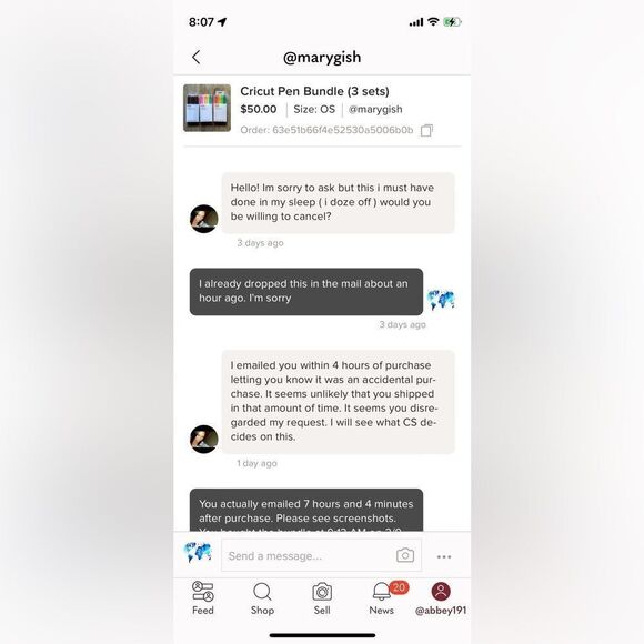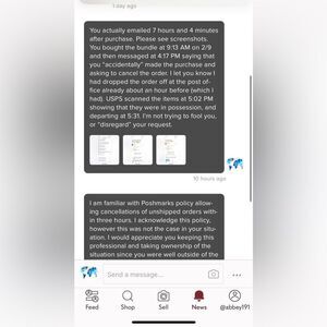 The person above claimed she “bought” something from my closet “in her sleep.” Asked for a cancellation 7 hours after purchase. I told her I couldn’t because I had already shipped. (Poshmark policy allows for cancellations 3 hours after ordering if seller hasn’t shipped). Then she harassed me with angry messages, calling me dishonest and being really rude. 😂 Stahhhhp. Her page shows a history of unpleasant interactions and unhappy customers. These are the people who make Poshmark not fun. I don’t need this shit. I’m just trying to ship fast for my Poshers!! Please join me in reporting her if you agree. If you disagree please lmk your take in the comments. I’m always open to other perspectives and trying to grow as a person but I won’t be walked all over because someone is having a bad life and is a bully 🤷🏼♀️
