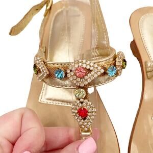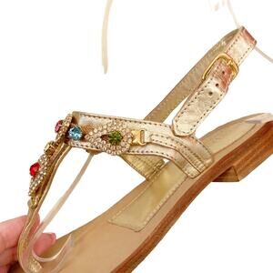 Metallic gold thong sandal is adorned with multicolor jewels and rhinestones. Adjustable ankle strap. Leather sole. Made in Italy. Euro size 36 = 5.5 US. Excellent like new condition. Worn once.