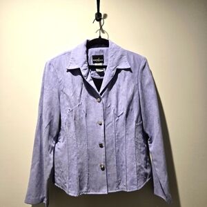 100% polyester. Lavender purple faux suede button down blazer jacket with black tank top. Great condition. Both are Size 12. Fits like a Women's XS. Ships fast and clean.