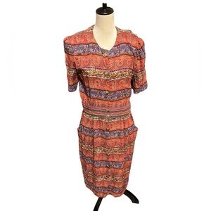 This vintage dress is a size 15/16 and requires dry cleaning only. It is a midi length dress with a flower theme and is suitable for summer, fall, and spring seasons. The dress is made in the United States and is perfect for women who want to add a touch of elegance to their wardrobe.