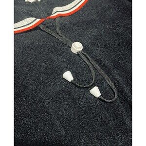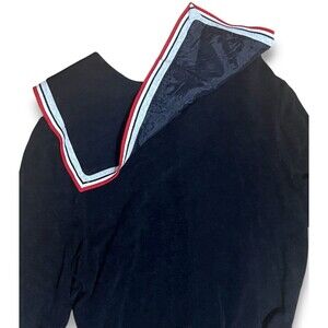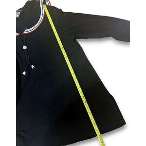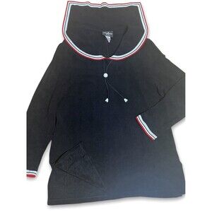 A gently pre-owned Womens top with a nautical, sailor vibe. Sleek black, light-weight terry cotton-like material with red/grey/white contrasting trim and an adjustable drawstring neckline. Long sleeve. Size 18. 42 chest. 30 shoulder to hem. No holes, stains. Vintage clothing made in USA. Originally part of a 2pc set.