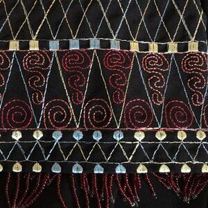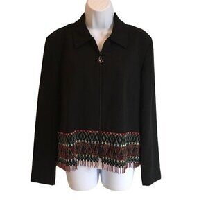 Positive Attitude Women’s Jacket Black with zipper and intricate embroidery and beaded trim on the hem. Absolutely stunning! This jacket is in excellent condition, but is missing the fabric content, washing instruction, and size tags. I would estimate this piece to be a Small to Medium. The approximate measurements laying flat are 19” pit to pit, 22” length, and 27 “sleeve length.