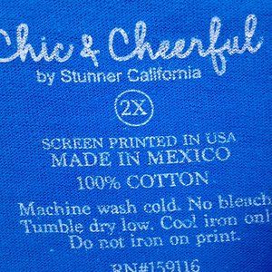 This shirt is new with tags. Chic & Cheerful by Stunner California shirt is blue, size 2X, colorful, 100% cotton, and machine washable. See picture for details. Message with any questions.
