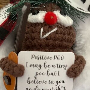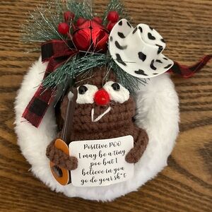 Charming brown ornament with a festive hat and humorous sign. Perfect for holiday decor.
