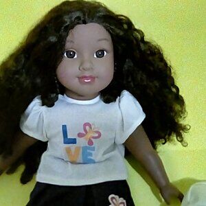 Her outfit includes a white hat, love shirt, shorts & matching white cloth boots