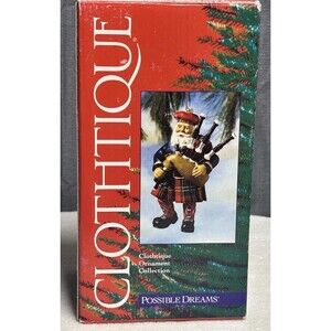 Bring a little Highland charm to your holiday décor with this 2000 Possible Dreams Clothtique Scottish Santa Ornament. Santa is dressed in full tartan kilt attire and posed playing the bagpipes — a detailed, well-made piece from the Clothtique Ornament Collection.