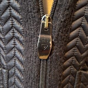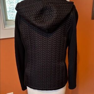 Luxury designer Post Card, cashmere blend mixed media, zip front jacket, wool/cashmere side panels (very soft), quilted front, back and hood, 24” length front center back to the hem, stretch at the side panels and arms, excellent condition, no odors. Made in Italy, size 44, fits like an 8. Lady GaGa was a model for this designer many years ago. Rare piece