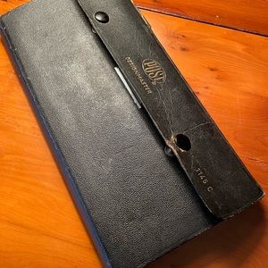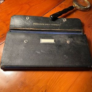 Vintage 1930’s Frederick Post Designmaster 1145C precision compass set used in hand drafting, among other things. Beautiful stainless tools, made in Germany. There are no open slots in the blue velvet lining of the case, so I believe it to be complete. However, research uncovered more than one version of the 1145.