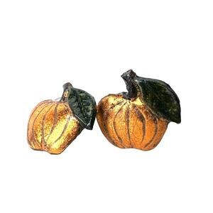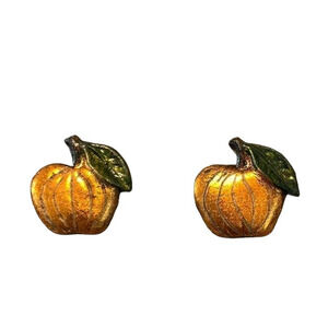 Add a touch of autumnal charm to your jewelry collection with these shimmery pumpkin post earrings. Perfect for Thanksgiving festivities, these metallic orange earrings feature a stud style design and are in excellent used condition. The vintage-inspired earrings are a unique addition to any fashionista's collection and are sure to complement any outfit with their colorful and festive design. Bring a little bit of the fall harvest to your accessory game with these stunning pumpkin earrings.