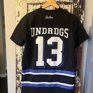 Black t-shirt featuring a bold wolf graphic with blue and white stripes. Number 13 detail adds a sporty touch. Some flaws small holes and markings. Washed and fresh. From smoke free home.