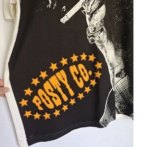 Post Malone Big Ass Stadium Tour graphic t-shirt in white. Features a large graphic of Post Malone on the front and a US map with tour dates on the back. "Posty Co." branding is prominent on both sides.