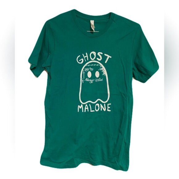 This silly graphic tee is a funny way to express your love of posty. Features a graphic of a ghost with Post Malone’s tattoos and the words “Ghost Malone” in white print on a Kelly green Bella Canvas tshirt. Size medium. 100% cotton.