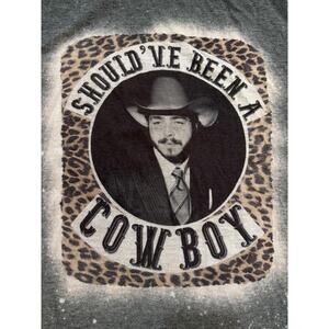 Graphic: Features a man in a cowboy hat and suit, surrounded by leopard print border, with the words "Should've Been A Cowboy"